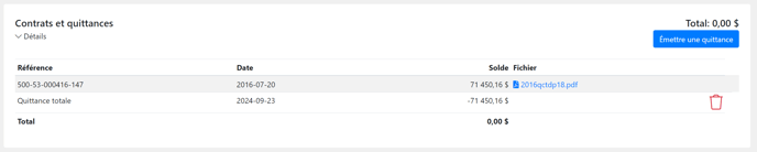 Une fois la quittance émise, le total de votre dossier sera mis à jour à «0,00 $» :