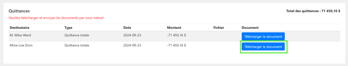 Une quittance peut également être téléchargée pour chacun des destinataires au bas de la page en cliquant sur «Télécharger le document» pour le destinataire choisi :