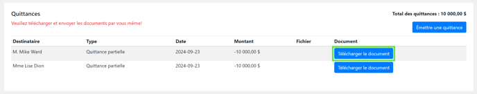 Une quittance peut également être téléchargée pour chacun des destinataires au bas de la page en cliquant sur «Télécharger le document» pour le destinataire choisi :
